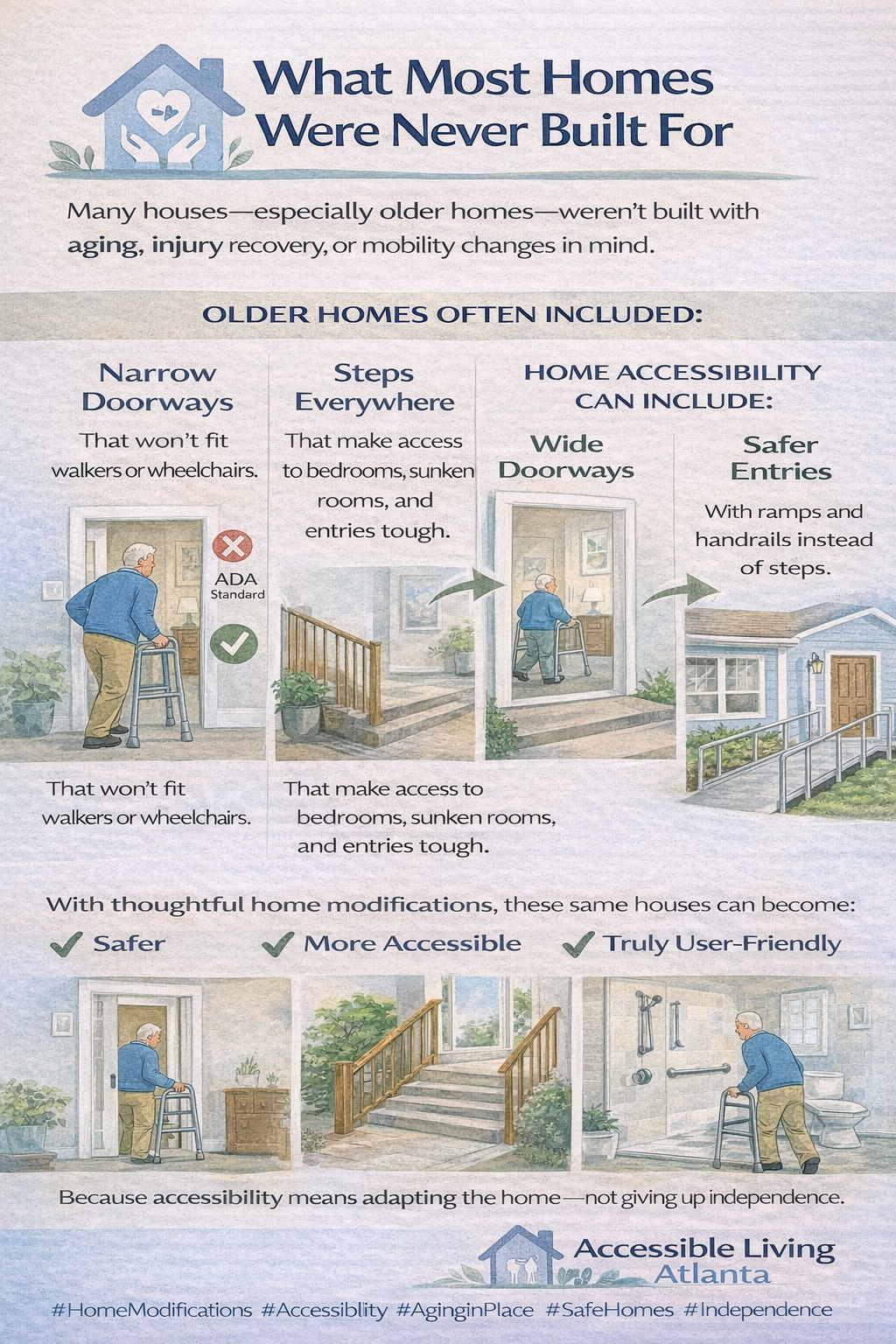 Many of the homes we live in today were designed decades ago — for a very different stage of life. As a result, they often fail to support aging in place , mobility changes, or recovery after injury. Here’s what most older homes were never built for: 🔹 Narrow doorways that can’t accommodate walkers or wheelchairs 🔹 Steps everywhere , from entryways to sunken rooms and stair-only access 🔹 Bathrooms designed for younger bodies , with tubs, low toilets, and slippery surfaces These design limitations don’t mean a home is “bad” — they simply mean it needs to evolve with the people living in it. At Accessible Living Atlanta , we specialize in home modifications that transform older homes into safe, accessible, and user-friendly spaces — without sacrificing comfort or dignity. Accessibility isn’t about changing who you are — it’s about changing the home to support independence at every stage of life.